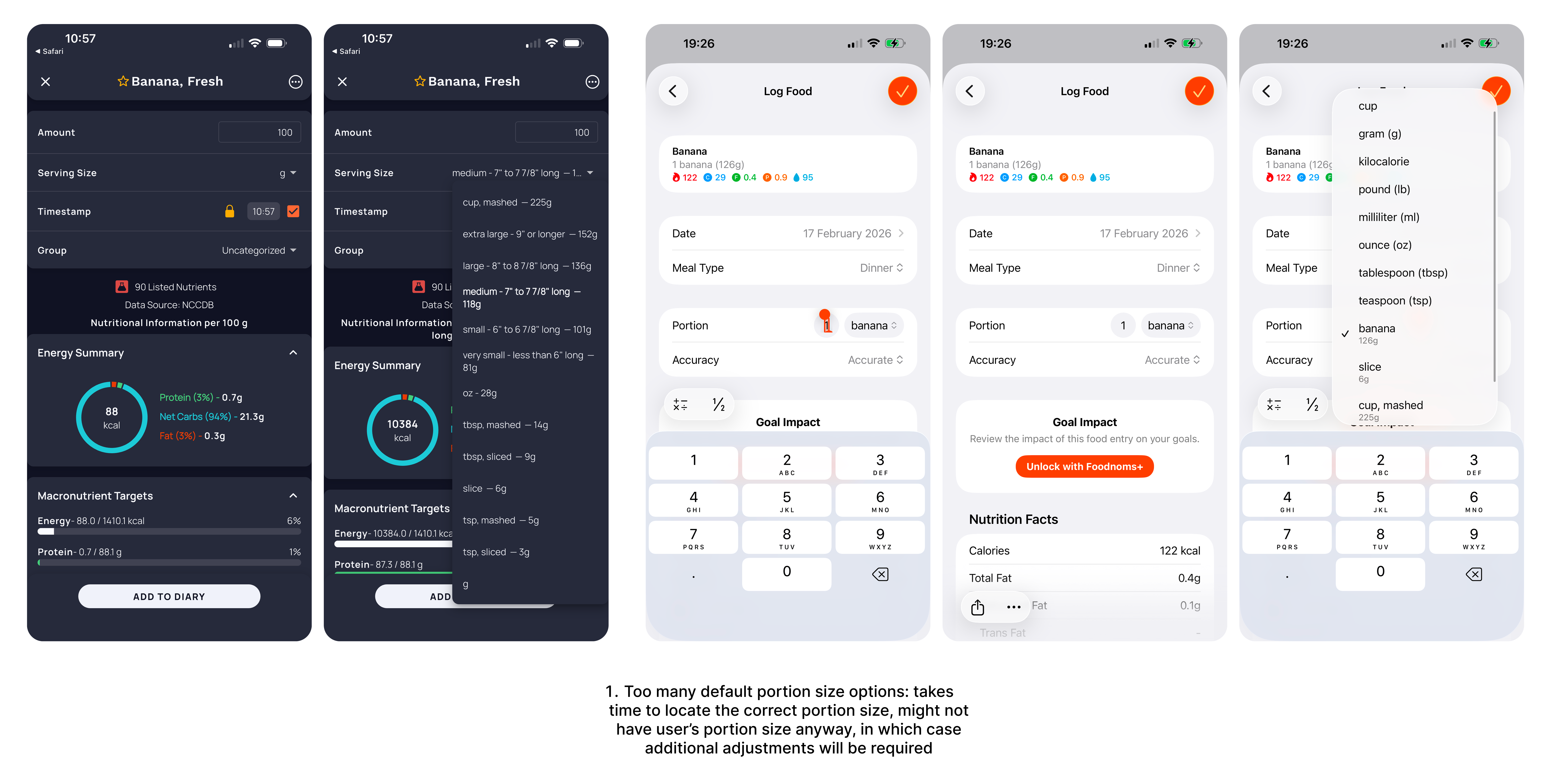 Possibly themost tedious part of the process - having to tell the app how much you consumed, especially if the app has a drop down menu of all options all at once. Oftentimes defalut measurement settings such as a cup, a serving, or 1 piece, are a challenge since this is not how I measure my food, and yet every time I have to scan the drop down menu for my preferred measurement unit.