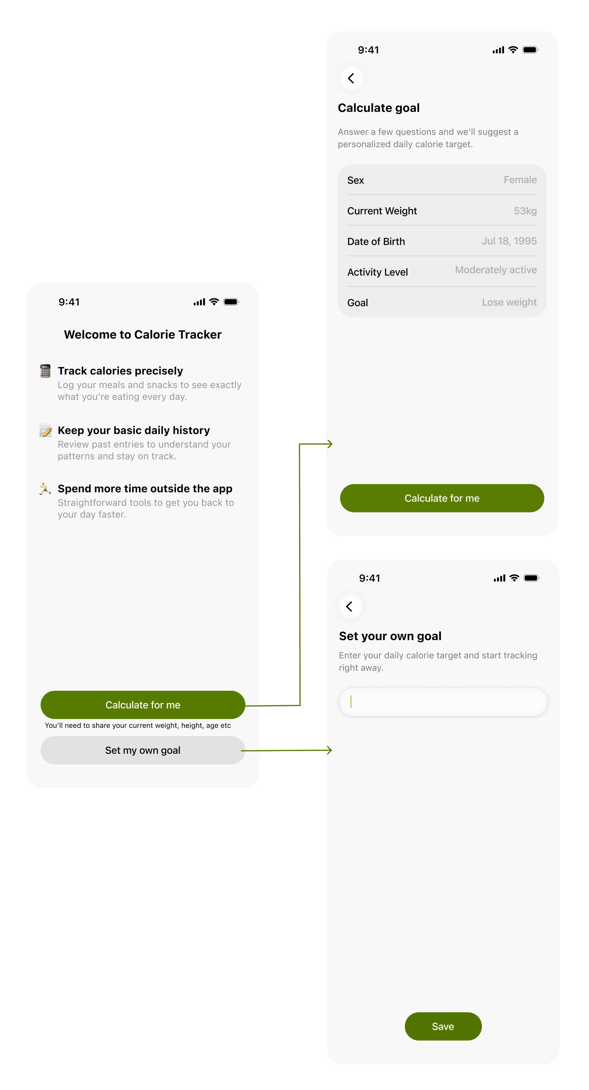 Users can choose between two paths: inputting their own daily calorie target or using the app's calculator.